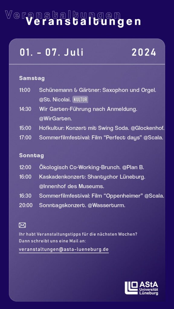 Calendar of events 01.07.2024 – 07.07.2024 29. June 2024 Last updated 5. March 2025 | Oeffentlichkeit AStA Events Alternative courses Scala Museum NiaDance St Nikolai Room of silence Glockenhof Anna and Arthur Cultural Forum Lüne Monastery Schröder’s garden University community checkpointqueer Lünebuch beekays Movie palace Cultural bakery Music school Salt Museum Theater Christmas town Mosaic Café Klatsch Campus Cinema – Unikino University sports