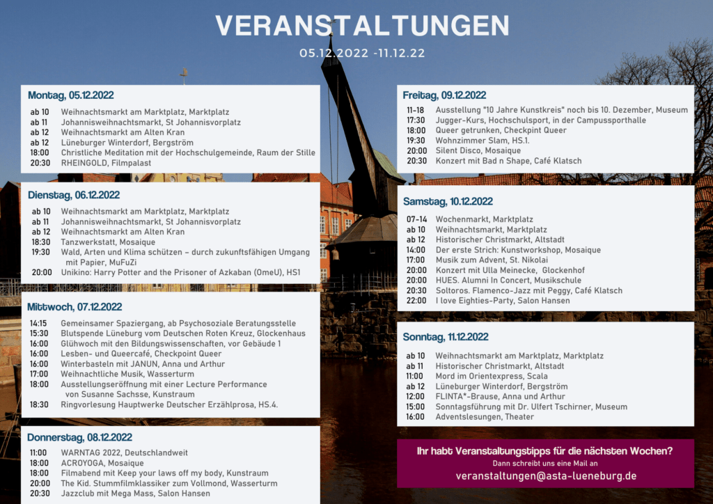 Calendar of events 05.12 – 11.12.22 5. December 2022 Last updated 5. March 2025 | Oeffentlichkeit AStA Events Alternative courses Scala Museum NiaDance St Nikolai Room of silence Glockenhof Anna and Arthur Cultural Forum Lüne Monastery Schröder’s garden University community checkpointqueer Lünebuch beekays Movie palace Cultural bakery Music school Salt Museum Theater Christmas town Mosaic Café Klatsch Campus Cinema – Unikino University sports