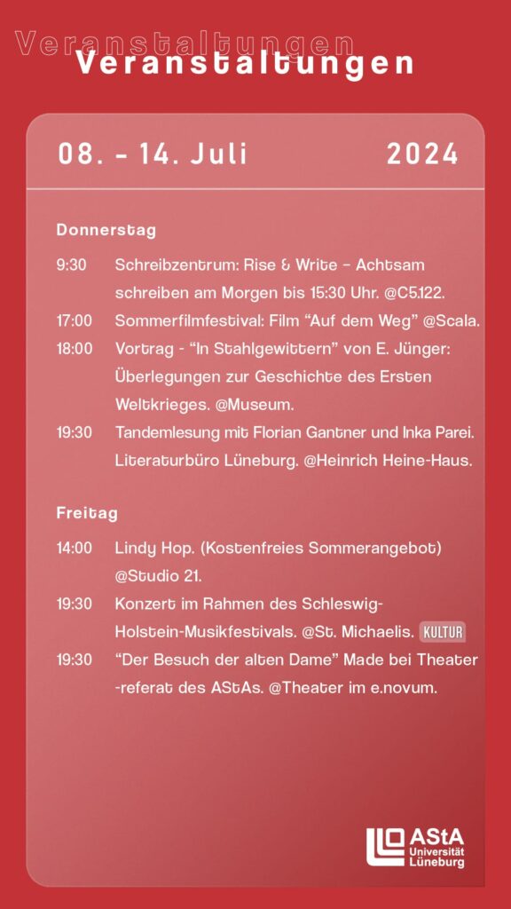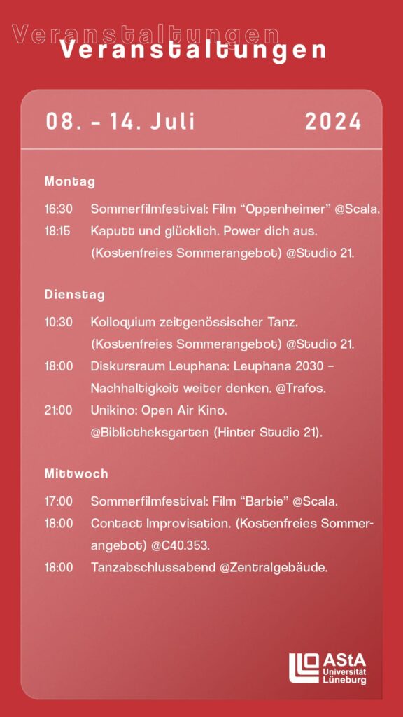Calendar of events 08.07.2024 – 14.07.2024 7. July 2024 Last updated 5. March 2025 | Oeffentlichkeit AStA Events Alternative courses Scala Museum NiaDance St Nikolai Room of silence Glockenhof Anna and Arthur Cultural Forum Lüne Monastery Schröder’s garden University community checkpointqueer Lünebuch beekays Movie palace Cultural bakery Music school Salt Museum Theater Christmas town Mosaic Café Klatsch Campus Cinema – Unikino University sports