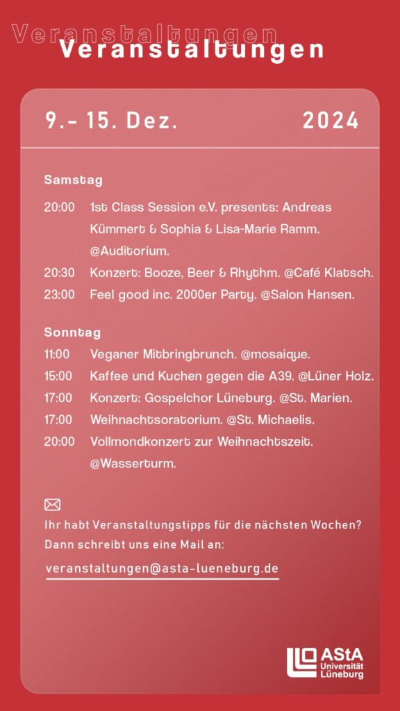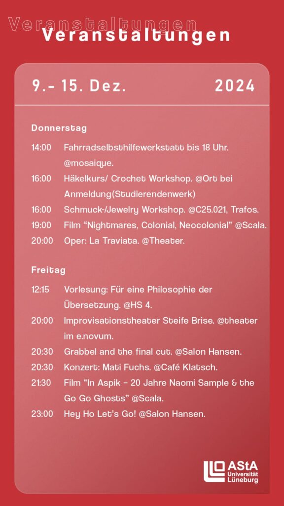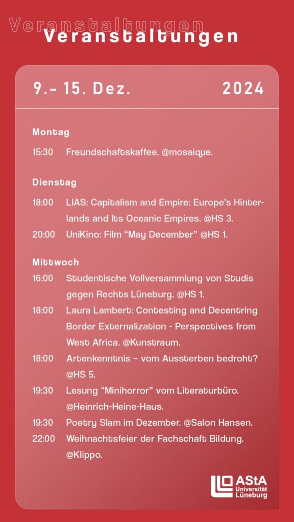 Calendar of events 09.12.2024 – 15.12.2024 8. December 2024 Last updated 5. March 2025 | Oeffentlichkeit AStA Events Alternative courses Scala Museum NiaDance St Nikolai Room of silence Glockenhof Anna and Arthur Cultural Forum Lüne Monastery Schröder’s garden University community checkpointqueer Lünebuch beekays Movie palace Cultural bakery Music school Salt Museum Theater Christmas town Mosaic Café Klatsch Campus Cinema – Unikino University sports