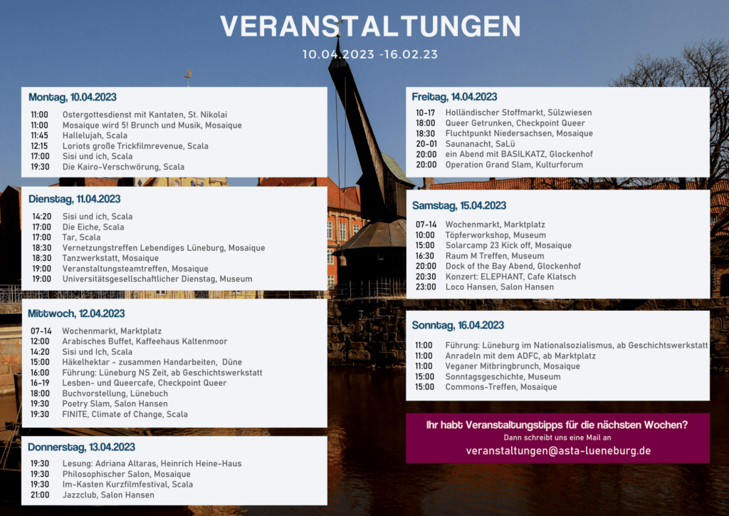 Calendar of events 10.04. – 16.04.2023 10. April 2023 Last updated 5. March 2025 | Oeffentlichkeit AStA Events Alternative courses Scala Museum NiaDance St Nikolai Room of silence Glockenhof Anna and Arthur Cultural Forum Lüne Monastery Schröder’s garden University community checkpointqueer Lünebuch beekays Movie palace Cultural bakery Music school Salt Museum Theater Christmas town Mosaic Café Klatsch Campus Cinema – Unikino University sports