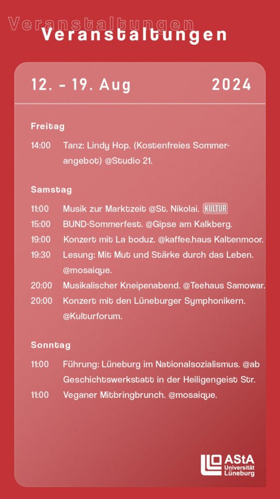 Calendar of events 12.08.2024 – 19.08.2024 12. August 2024 Last updated 5. March 2025 | Oeffentlichkeit
