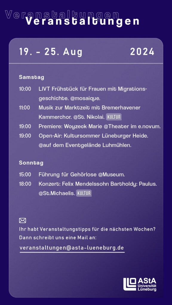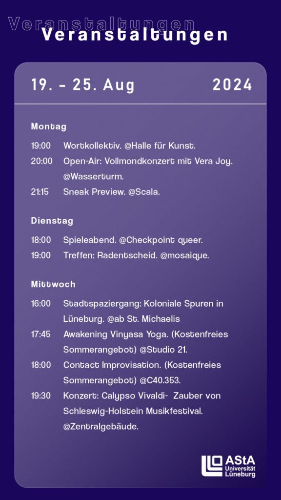 Calendar of events 19.08.2024 – 25.08.2024 19. August 2024 Last updated 5. March 2025 | Oeffentlichkeit AStA Events Alternative courses Scala Museum NiaDance St Nikolai Room of silence Glockenhof Anna and Arthur Cultural Forum Lüne Monastery Schröder’s garden University community checkpointqueer Lünebuch beekays Movie palace Cultural bakery Music school Salt Museum Theater Christmas town Mosaic Café Klatsch Campus Cinema – Unikino University sports