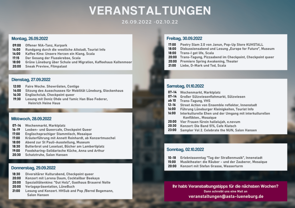 Calendar of events 26.09. – 02.10.22 26. September 2022 Last updated 5. March 2025 | Oeffentlichkeit AStA Events Alternative courses Scala Museum NiaDance St Nikolai Room of silence Glockenhof Anna and Arthur Cultural Forum Lüne Monastery Schröder’s garden University community checkpointqueer Lünebuch beekays Long Night of the Museums Movie palace Cultural bakery Music school Salt Museum Theater