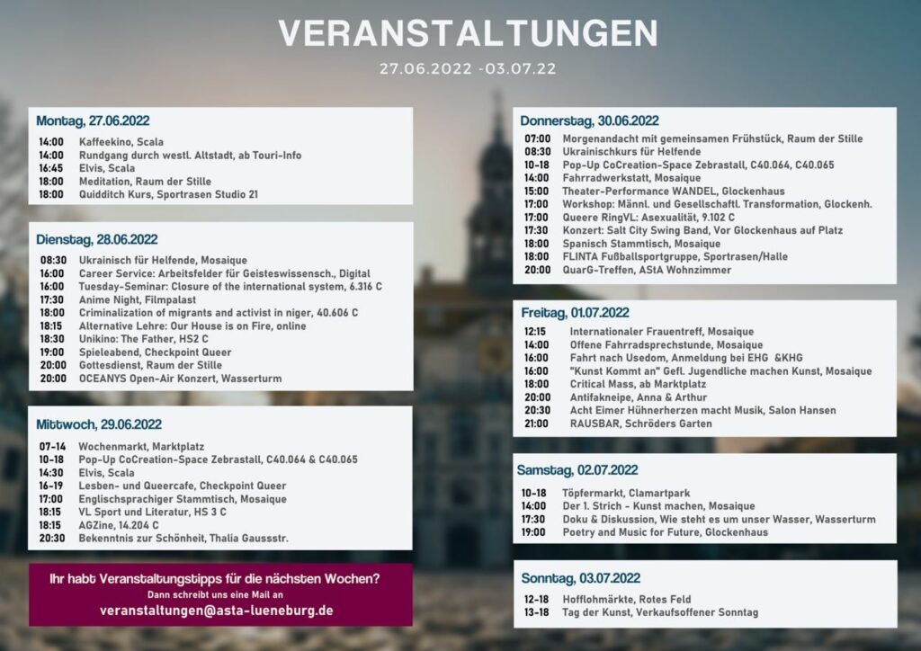 Calendar of events 27.05 – 03.07.22 28. June 2022 Last updated 5. March 2025 | Oeffentlichkeit AStA Events Alternative courses Mosaic Scala Museum NiaDance St Nikolai checkpointqueer University community Room of silence Glockenhof Anna and Arthur Cultural Forum Theater Lüne Monastery Schröder’s garden Peace Alliance Critical Mass VHS