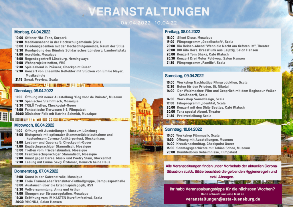 Veranstaltungskalender 04.04.-10.04.22 4. April 2022 Last updated 5. March 2025 | Oeffentlichkeit AStA Events Alternative courses Mosaic Scala Museum NiaDance St Nikolai checkpointqueer University community Room of silence Heinrich Heine House Salon Hansen Glockenhof Theater Café Klatsch Fimpalast VHS Music school Short film festival (workshops and film programs at Scala)