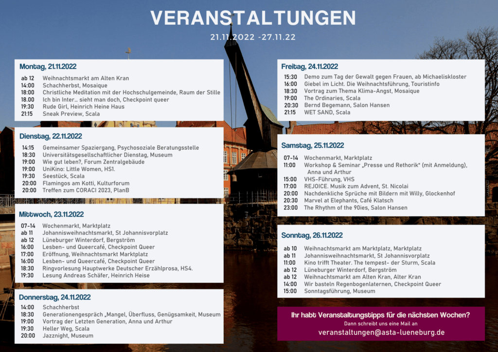 Veranstaltungskalender 21.11-27.11.22 20. November 2022 Last updated 5. March 2025 | Oeffentlichkeit AStA Events Alternative courses Scala Museum NiaDance St Nikolai Room of silence Glockenhof Anna and Arthur Cultural Forum Lüne Monastery Schröder’s garden University community checkpointqueer Lünebuch beekays Long Night of the Museums Movie palace Cultural bakery Music school Salt Museum Theater
