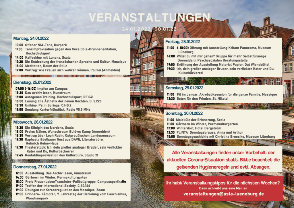 Veranstaltungskalender 24.01-30.01.22 24. January 2022 Last updated 5. March 2025 | Oeffentlichkeit AStA Events Alternative courses Mosaic Room of silence Scala Porcelain bead Museum Art space University sports Cultural Office Anna and Arthur NiaDance Literary office Police lecture Dream room State Museum Cultural bakery Wandrahmpark Psychosocial counseling center St Nikolai