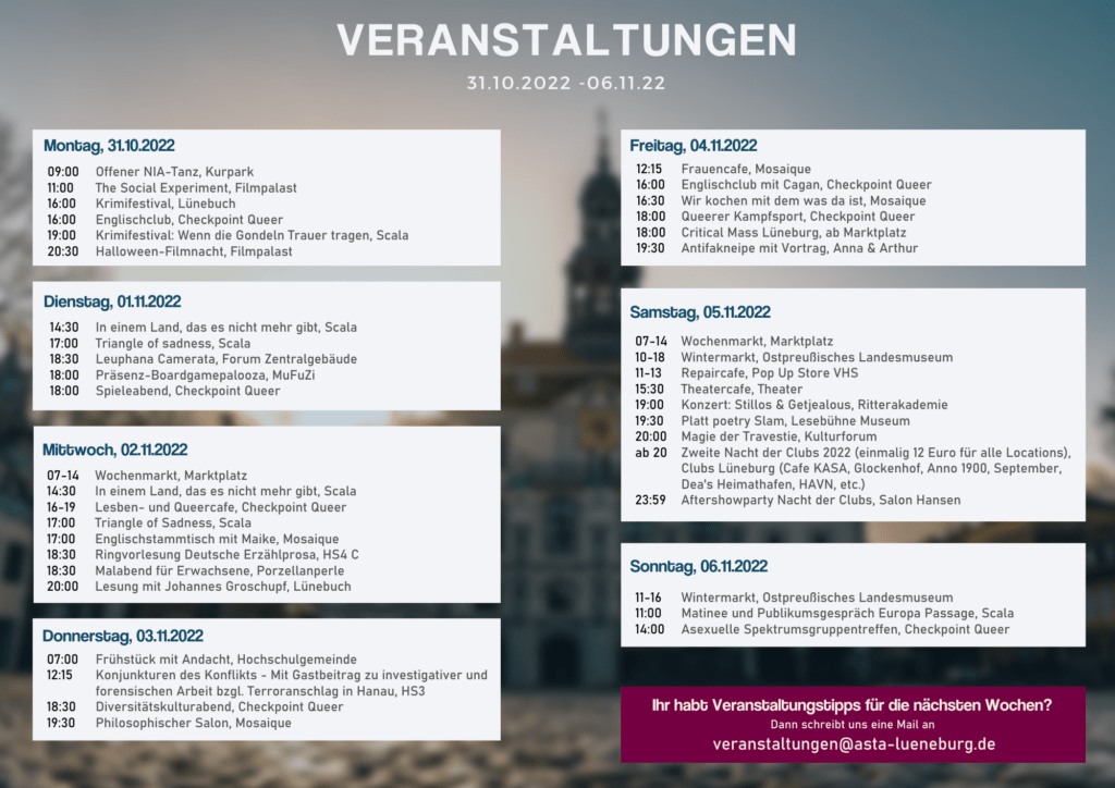 Veranstaltungskalender 31.10.-06.11.22 31. October 2022 Last updated 5. March 2025 | Oeffentlichkeit AStA Events Alternative courses Scala Museum NiaDance St Nikolai Room of silence Glockenhof Anna and Arthur Cultural Forum Lüne Monastery Schröder’s garden University community checkpointqueer Lünebuch beekays Long Night of the Museums Movie palace Cultural bakery Music school Salt Museum Theater