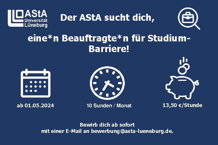 Aufgaben Voraussetzungen Der AStA ist die gewählte Vertretung der Lüneburger Studierenden. Er unterhält verschiedene Serviceangebote (KonRad, EliStu, BAföG-Beratung, Verleihservice, Bürodienst, etc.), organisiert kulturelle Veranstaltungen, macht politische Bildungsarbeit und vertritt die Studierenden in der Öffentlichkeit gegenüber der...