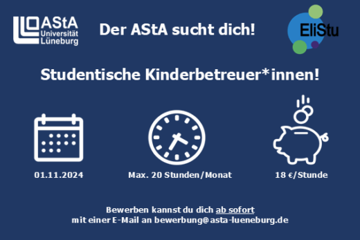 EliStu ist eine Beratungsstelle, Betreuungsangebot und Interessenvertretung für studentische Eltern. Hierbei handelt es sich um ein gemeinsames Projekt des AStA, des Gleichstellungsbüros der Leuphana Universität Lüneburg sowie des Studentenwerks. Aufgaben Anforderungen Deine Bewerbung (Lebenslauf ohne Bild...