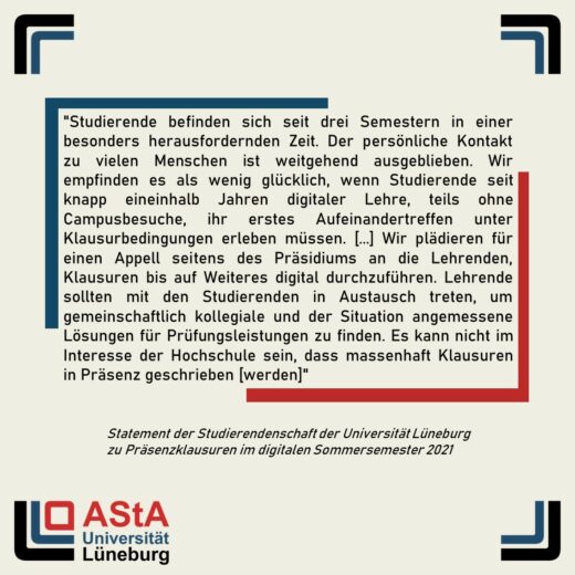 Liebe Studis,nachdem am 31.05. in der Mail des Präsidiums eine mögliche Rückkehr zu Präsenzprüfungen angekündigt wurde, haben uns zahlreiche Nachrichten erreicht, die von Problemen und Sorgen berichten, welche mit Prüfungen am Campus einhergehen.Nach intensivem Austausch und...