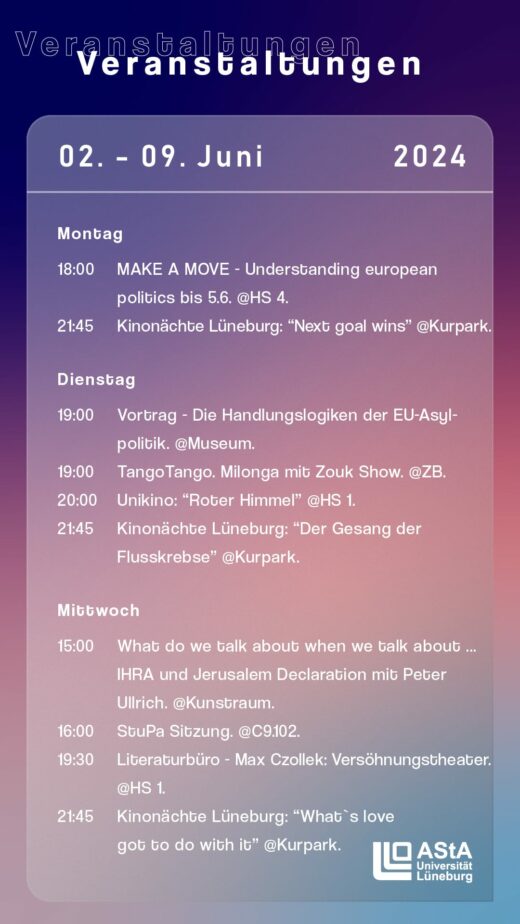 Aktuelles / AStA News / Veranstaltungskalender 2. Juni 2024 von Oeffentlichkeit · Published 2. Juni 2024 · Last modified 16. Juni 2024 Veranstaltungskalender 03.06.2024 – 09.06.2024 Last updated 16. Juni 2024 | Oeffentlichkeit