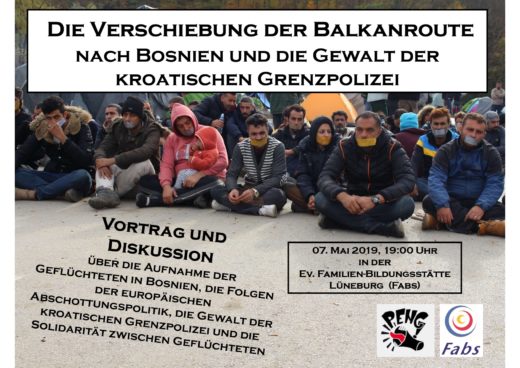 DIE VERSCHIEBUNG DER BALKANROUTE nach Bosnien und die Gewalt der kroatischen Grenzpolizei VORTRAG, BILDER UND DISKUSSION mit Sascha Schießl, vom Flüchtlingsrat Niedersachsen– über die Aufnahme der Geflüchteten in Bosnien, – die Folgen der europäischen Abschottungspolitik,– die...