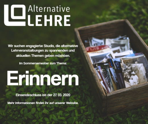 Wir suchen Eure Konzepte für die Alternative Lehre im Sommersemester zum Thema “Erinnern”. Einreichfrist ist der 27.03.2020. „Erinnern“, dass kann sehr persönlich sein, aber auch kollektiv geschehen. Wir erinnern uns an Menschen, an Erfahrungen und an...
