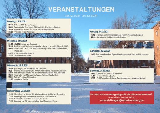 AStA Veranstaltungen und Kennenlerntreffen Alternative Lehrveranstaltungen Theater Lüneburg Mosaique Glockenhof Weihnachtsmärkte Raum der Stille Scala Porzellanperle Museum St Johannes St Nicolai