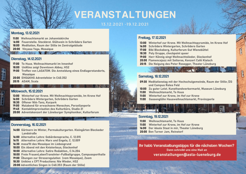 Veranstaltungen 13-19.12.21 13. Dezember 2021 Last updated 13. Dezember 2021 | Oeffentlichkeit AStA Veranstaltungen und Kennenlerntreffen Alternative Lehrveranstaltungen Theater Lüneburg Gut Wienebüttel Café Klatsch Mosaique Glockenhof Weihnachtsmärkte Raum der Stille checkpoint queer Scala Porzellanperle Museum Kulturbüro Reinstorf