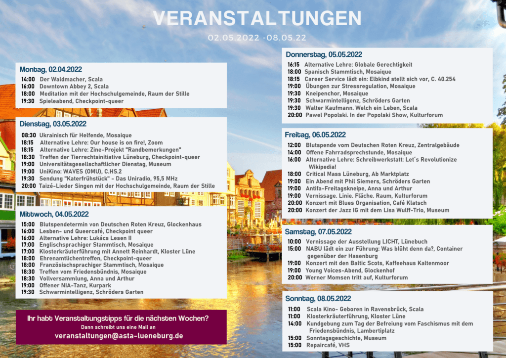 Willkommen in Lüneburg! Auf dieser Website findest du alles, was du für und um dein Studium wissen musst. Hast du Fragen oder willst du bei uns mitmachen? Dann schreib' uns einfach eine Mail!