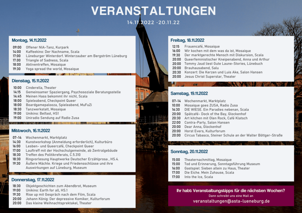 Willkommen in Lüneburg! Auf dieser Website findest du alles, was du für und um dein Studium wissen musst. Hast du Fragen oder willst du bei uns mitmachen? Dann schreib' uns einfach eine Mail!