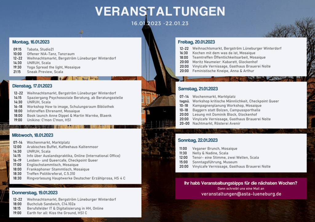 Veranstaltungskalender 16.01.-22.01.2023 16. Januar 2023 Last updated 23. Januar 2023 | Oeffentlichkeit AStA Veranstaltungen Alternative Lehrveranstaltungen Scala Museum NiaTanz St Nikolai Raum der Stille Glockenhof Anna und Arthur Kulturforum Kloster Lüne Schröders Garten Hochschulgemeinde checkpointqueer Lünebuch beekays Filmpalast Kulturbäckerrei Musikschule Salzmuseum Theater Weihnachtsstadt Mosaique Café Klatsch Unikino Hochschulsport