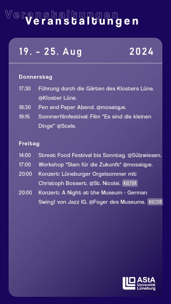 Veranstaltungskalender 19.08.2024 – 25.08.2024 19. August 2024 Last updated 5. Mai 2025 | Veranstaltungen AStA Veranstaltungen Alternative Lehrveranstaltungen Scala Museum NiaTanz St Nikolai Raum der Stille Glockenhof Anna und Arthur Kulturforum Kloster Lüne Schröders Garten Hochschulgemeinde checkpointqueer Lünebuch beekays Filmpalast Kulturbäckerrei Musikschule Salzmuseum Theater Weihnachtsstadt Mosaique Café Klatsch Unikino Hochschulsport