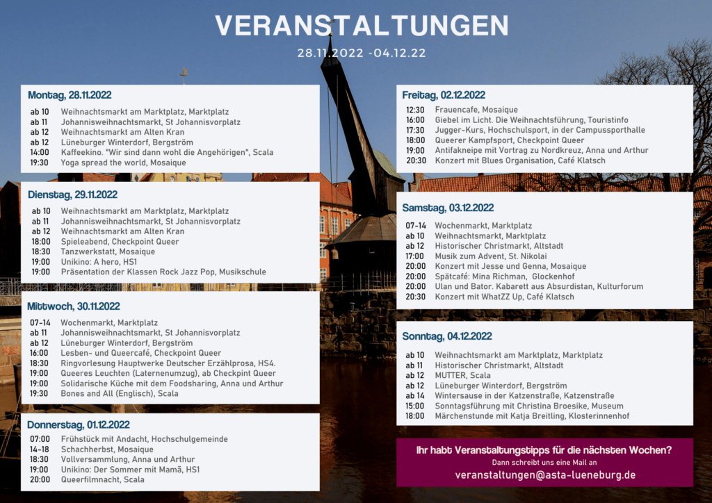 Willkommen in Lüneburg! Auf dieser Website findest du alles, was du für und um dein Studium wissen musst. Hast du Fragen oder willst du bei uns mitmachen? Dann schreib' uns einfach eine Mail!
